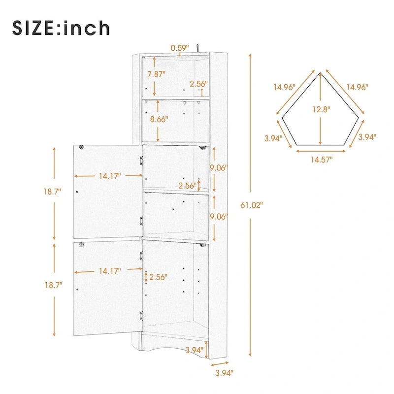 [Stylish and Considerate Details] The bathroom cabinet is designed as a triangle shape to stand in the corner to save more space in your home. Furthermore, the rhombus pattern on the door and curved line in the base add more elegant elements to this cabinet. Metal round door handles and magnet door button comfort users when open and close the door.