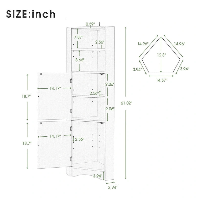 [Adjustable Shelves] This corner cabinet contains two movable shelves that allows you to install it in the up, middle or down part of the cabinet to divide the storage space. What's more, each shelf can be adjusted to different heights according to the pre-drilled holes. It totally satisfies home storage needs.